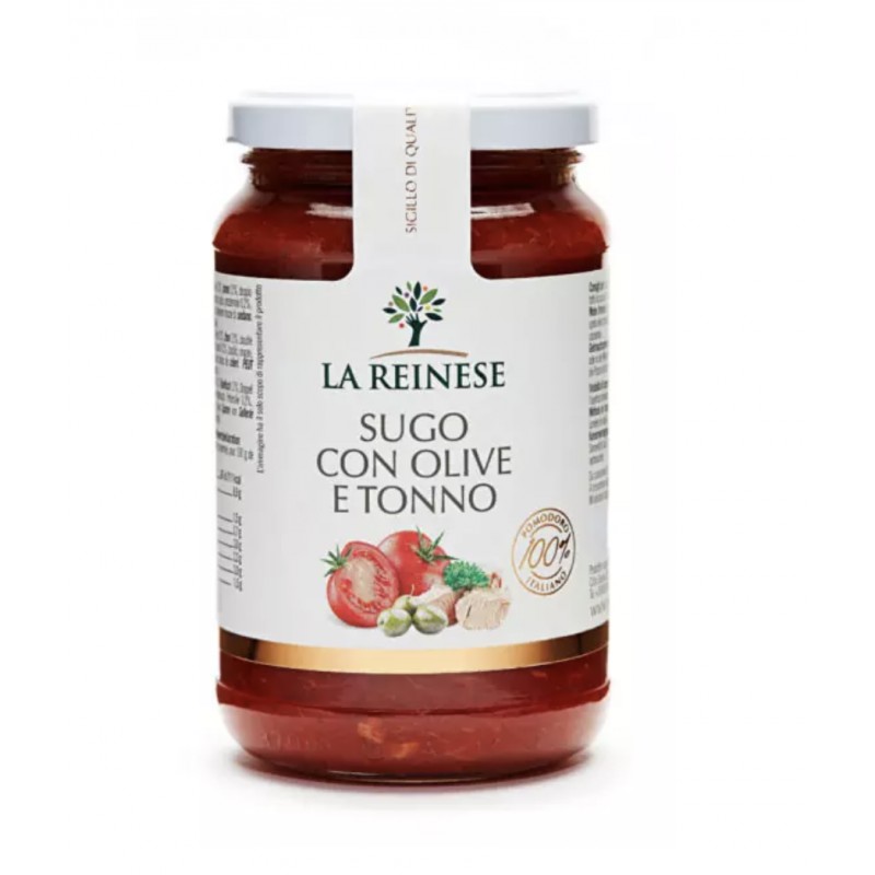 Skład: pulpa pomidorowa (65%), oliwki (12%), TUŃCZYK (11%), podwójnie skoncentrowany koncentrat pomidorowy, oliwa extravergine z oliwek, cebula, sól, cukier, czosnek, pietruszka 0,2%, bazylia, oregano, korektory kwasowości: kwas cytrynowy, kwas mlekowy. Może zawierać śladowe ilości SELERA. Bez glutenu. MOŻE ZAWIERAĆ FRAGMENTY PESTEK.